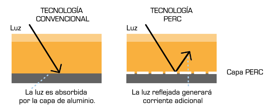 La tecnologa PERC (Passivated Emitter Rear Cell), es aquella que aade una capa adicional en la parte trasera de la placa solar, reflejando as parte de los fotones que consiguen pasar a travs de la clula, aumentando la eficiencia total.